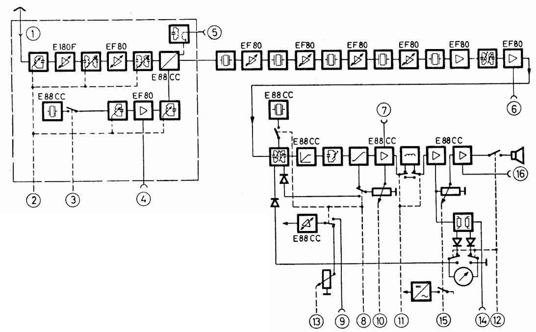 V1 (E180F, HF-Vorstufe); V2 (EF80, HF-Vorstufe); V3 (E88CC, Mischstufe); V4 (EF80, Oszillator); V5 - V10 (sechs EF80, 1.-6. ZF-Stufe); Gl.diode (Demodulation); V11 (E88CC, BFO); V12 (E88CC, FM Limiter); V13 (E88CC, FM-Diskriminator); V14 (E88CC, AGC-Verstärker); V15 (E88CC, NF-Ausgangsstufe).
