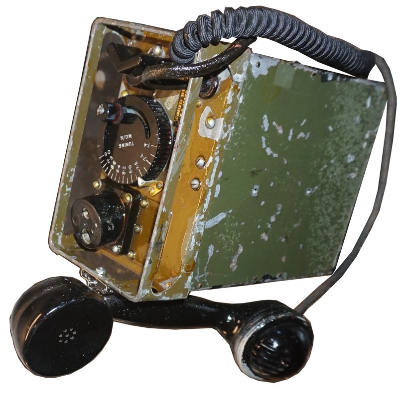 Auf der Frontplatte findet sich links der Sockel mit der Antennenbuchse, in der Mitte die runde Frequenzskala, die zum Abstimmen gedreht wird, mit einer mechanischen Blockierung und rechts neben dem Kabel zur Sprechgarnitur der V-förmige Sende- Empfangsumschalter.
