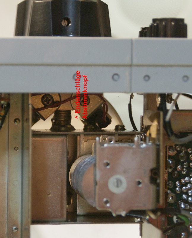 Auf dem Chassis sind die zwei Hauptplatinen gut zugänglich, zur Reinigung des Drehkondensators der Hauptabstimmung kann von unten mit zwei Schrauben ein Abdeckblech entfernt werden. Hier lohnt es sich, gleich die Reihe von eigenartigen Unterlagsscheiben zwischen zwei Metallanschlägen zu reinigen / besprühen, sie dienen zum Endanschlag der Hauptabstimmung und machen ein eigenartiges Gefühl beim Vor- und Zurückkurbeln, wenn sie verharzt sind.