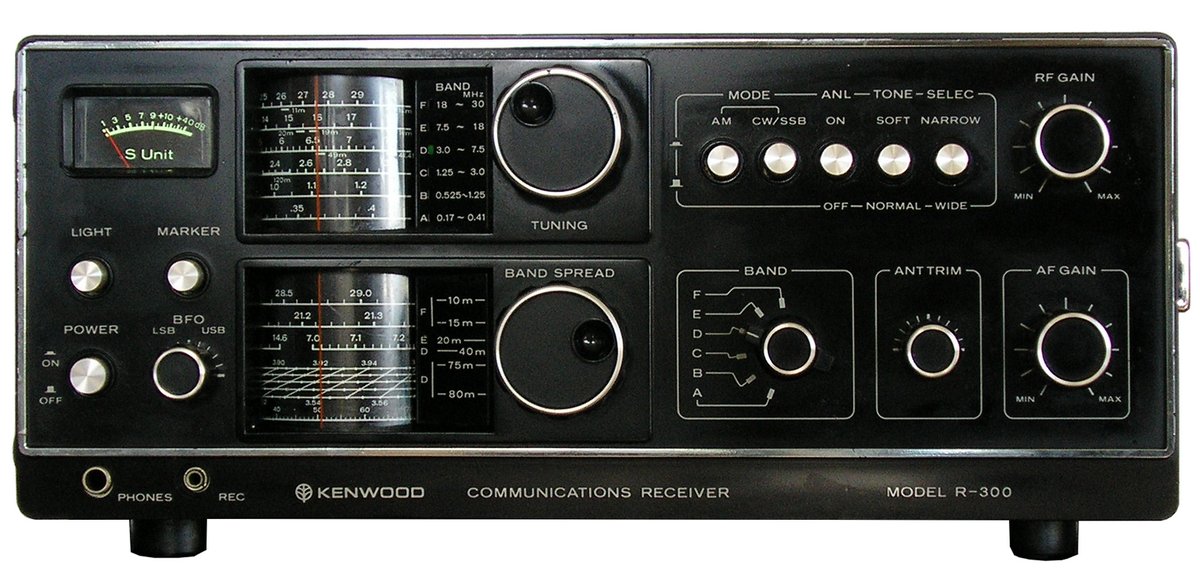 The Kenwood R-300 was the first receiver from the R-xxxx series and, in contrast to the later sets, had only an analogue frequency dial, the later sets all came with digital frequency displays. The fully transistorised all wave receiver has dimensions of 36 x 16.5 x 30 cm and has a black metal cabinet. The control elements were adapted to the taste of the time, instead of the controls of the QR-666, which were reminiscent of screw in fuse holders, the R-300 has black buttons with silver accents. On the one hand, the frequency setting is done with a coarse tuning dial, on the other hand, frequencies in the amateur radio bands can be set more precisely on a band spread dial.