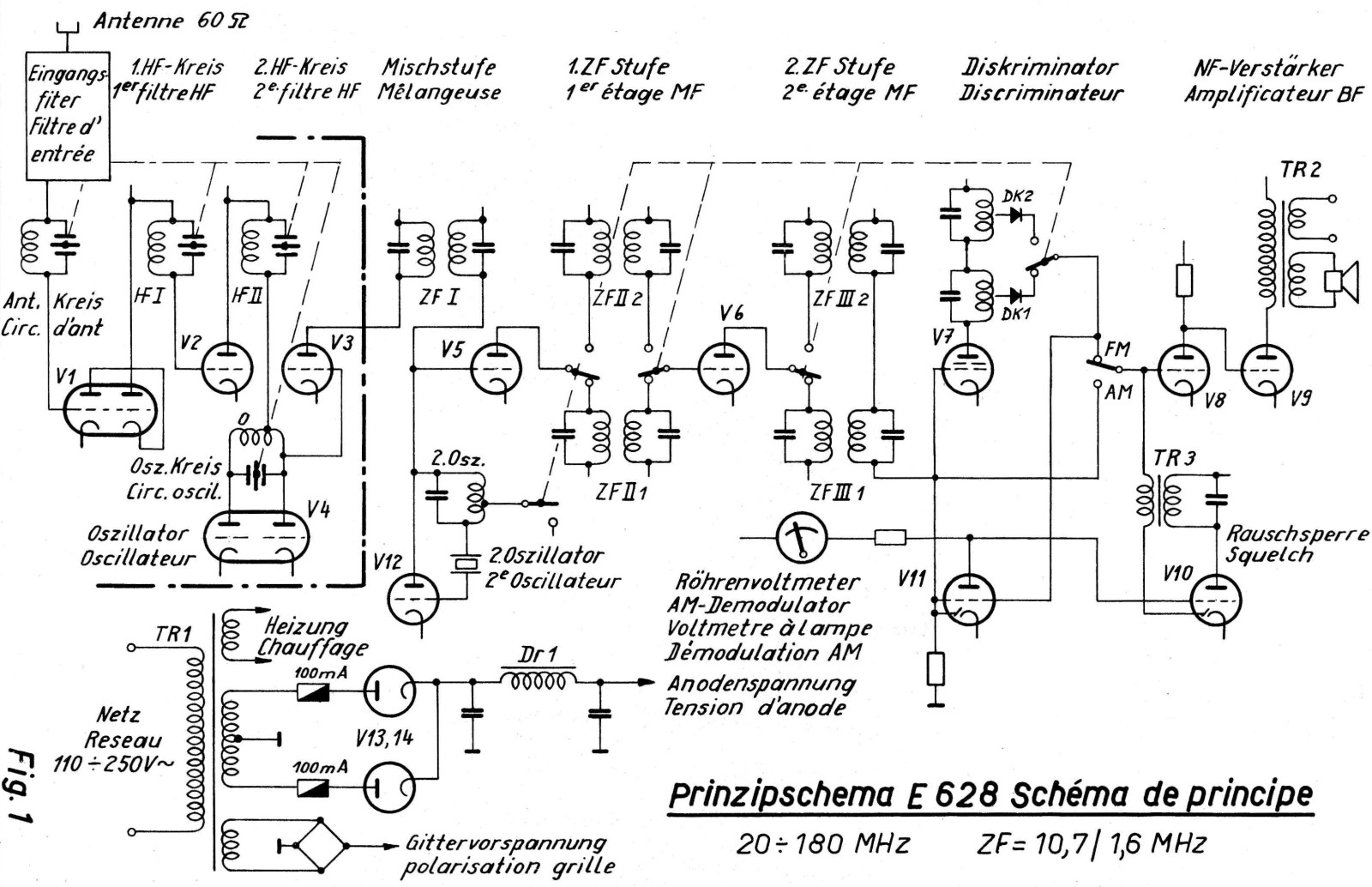 In parallel to their shortwave receiver E-627, Autophon did develop the VHF-receiver E-628 with coverage of the VHF Air band in AM in the middle of the fifties. This receiver was based on a project of a receiver similar to the E44.
