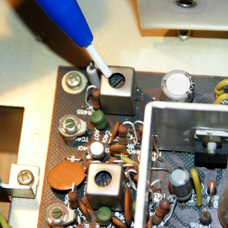 Zum Abgleich müssen zunächst Abgleichschraubendreher aus nicht magnetischem Material beschafft werden, beispielsweise keramische Abgleichsschraubendreher von Conrad oder Amazon. Mit metallischen Schraubendrehern darf nicht an den Spulenkörpern und Trimmkondensatoren hantiert werden, Ausgangsposition aufzeichnen oder photographieren und nur ganz sparsam verdrehen.