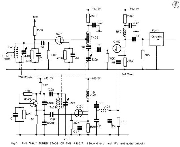 2. Zweite ZF TC401, TC402, T401 und T402: zum Einstellen des Gleichlaufs innerhalb der MHz-Bereiche wird der Signalgenerator an SW2 auf 7.1 MHz eingestellt und der Empfänger darauf abgestimmt. Der Pegel des 7.1 MHz-Signals wird nun so eingestellt, dass das S-Meter S=3 anzeigt. Nun werden die Trimmkondensatoren TC401 und TC402 abgestimmt, bis der Ausschlag am S-Meter maximal ist. Nun werden Signalgenerator und Empfänger auf 7.9 MHz eingestellt und am oberen Ende des 7 MHz-Bereichs mit den Spulenkörpern T401 und T402 auf maximalen Ausschlag am S-Meter abgestimmt. Dieser Vorgang ist einige Male zu wiederholen, da sich bei Nachstimmung am oberen Bandende das Maximum bei 7.1 MHz verschieben kann, und umgekehrt.