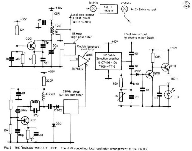 - MHz-Setting T201 und TC201 auf der OSC(illator) UNIT PB-1523: Einstellung der Position des Einrastens des MHz-Oberwellenoszillators für die MHz-Bereichseinstellung. Ein Signalgeneratorsignal von 3.5 MHz wird auf den PL-Antenneneingang SW2 gegeben und der Empfänger darauf abgestimmt. Mit Verstellen des Spulenkörpers von T201 kann erreicht werden, dass die Anzeige LOCK für das Einrasten des MHz-Oberwellenoszillators genau in der Mitte der 3 MHZ-Marke erlischt. Dann wird der Empfänger auf ein Signalgeneratorsignal von 27.5 MHz abgestimmt und der Trimmkondensator TC201 vorsichtig verstellt, bis die Lock-Lampe genau in der Mitte der 27 MHz-Marke erlischt. Nun sollte die LOCK-lampe genau in der Mitte jeder MHz-Bereichsmarke erlöschen und so das Einrasten der Wadley-Loop-Schaltung anzeigen.