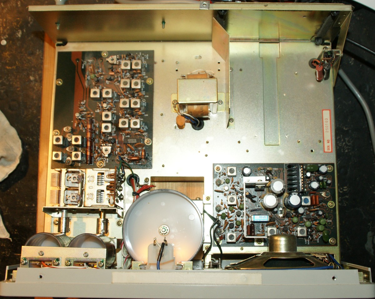Nach Entfernung von ca. 10 kleinen Metallschrauben an der Ober- und Unterseite des Geräts kann das Chassis einfach nach vorn aus dem Gehäuse gezogen werden. Bei diesem Gerät waren nachträglich Gummifüsse mit zu langen Schrauben montiert worden, welche das Heruasziehen des Chassis zunächst blockierten.