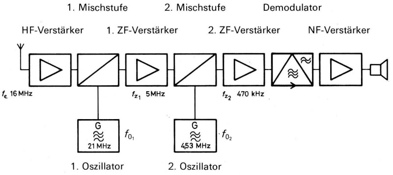 Das Antennensignal wird beim Doppelsuper mit einem wesentlich höherfrequenten Oszillatorsignal gemischt, so dass eine erste Zwischenfrequenz im Bereich von beispielsweise 5 MHz entsteht. Diese durchläuft Bandfilter, wird verstärkt und mit einem zweiten Oszillator auf eine zweite Zwischenfrequenz umgesetzt. Die definitive, die Empfänger-Trennschärfe bedingende Filterung und Verstärkung kann nun mit wesentlich einfacheren Mitteln geschehen.