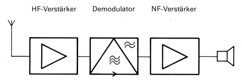 Um Lautsprecherempfang zu erlauben ist in der Regel nach der Demodulation eine NF-Vorverstärkerstufe und eine NF-Ausgangsstufe notwendig (Beispiel zwei HF-Vorverstärkerstufen, zwei NF-Stufen: 2 - V - 2).