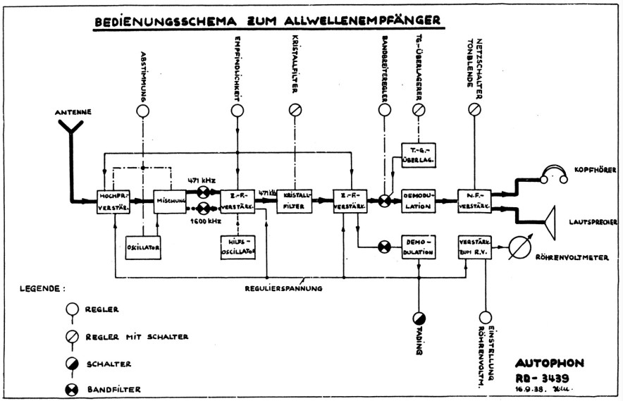 V1 EF5 (HF-Vorstufe); V2 EH2 (Mischstufe); V3 EBC3 (Oszillator); V4 EK2 (1. ZF-Stufe, Hilfsoszillator 1600 kHz); V5 EF5, 2. ZF-Stufe); V6 EBC3, Demodulator, NF-Vorstufe); V7 EL3 (NF-Endröhre); V8 EF6, Schwundausgleichverstärker); V9 EB4 (Diodengleichrichter für Schwundausgleich); V10 EF5 (Röhrenvoltmeter); V11 EF6 (Telegraphieüberlagerer / BFO).